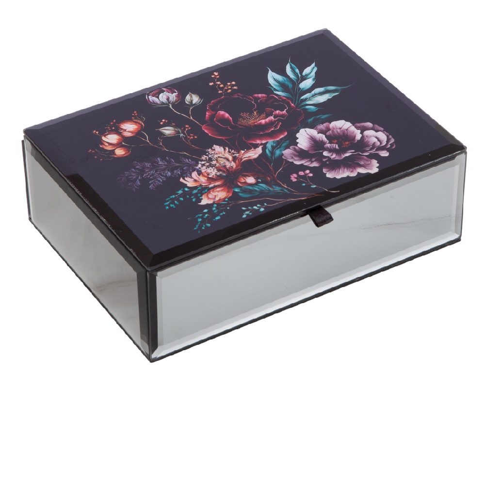H:8 x W:18 x D:13 cm – Glass mirror patterned jewellery box with single storage area felt lined split into 3 compartments & ring storage.