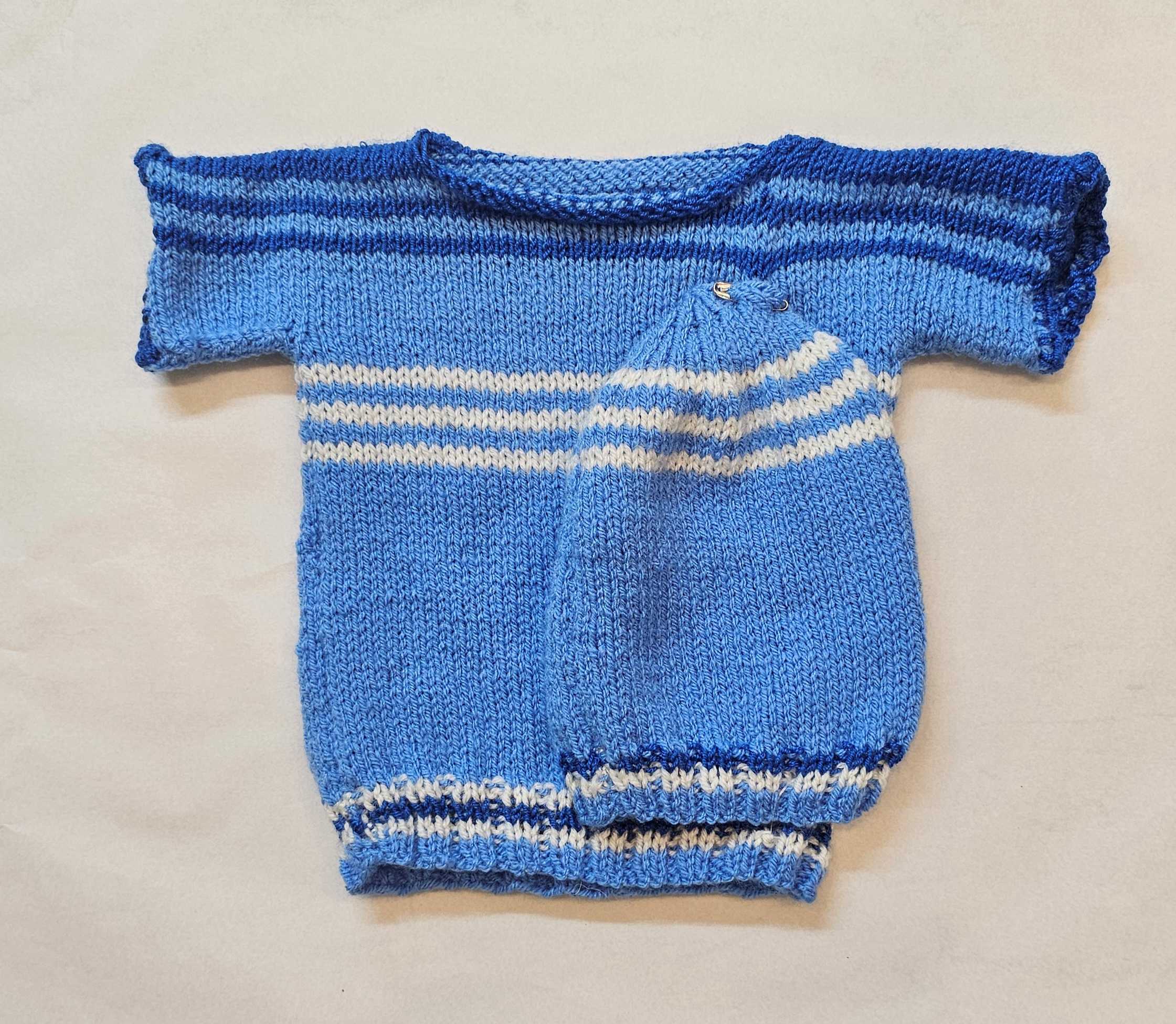 Vest & Hat Blue w Strips 3mths wool 4ply