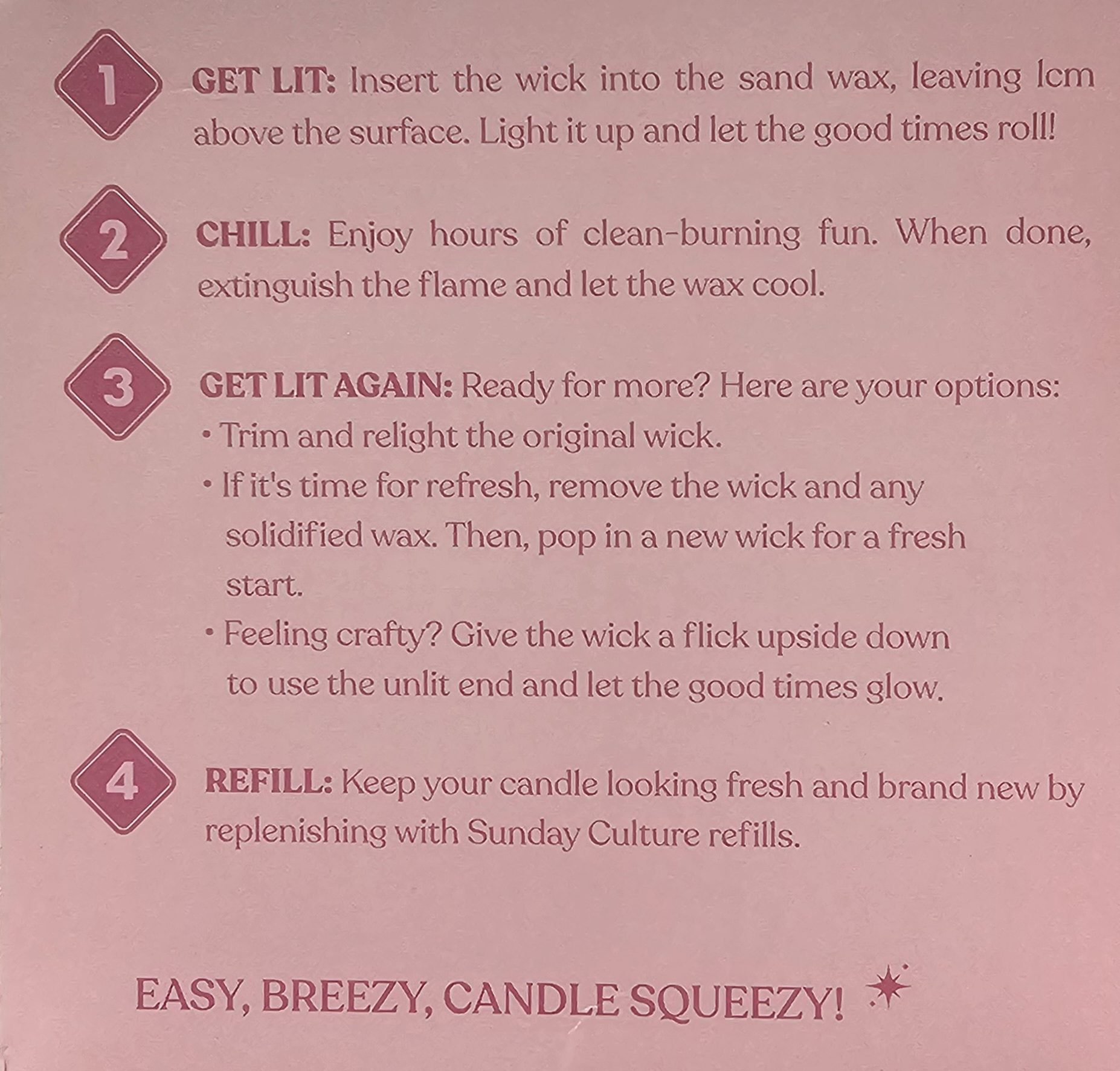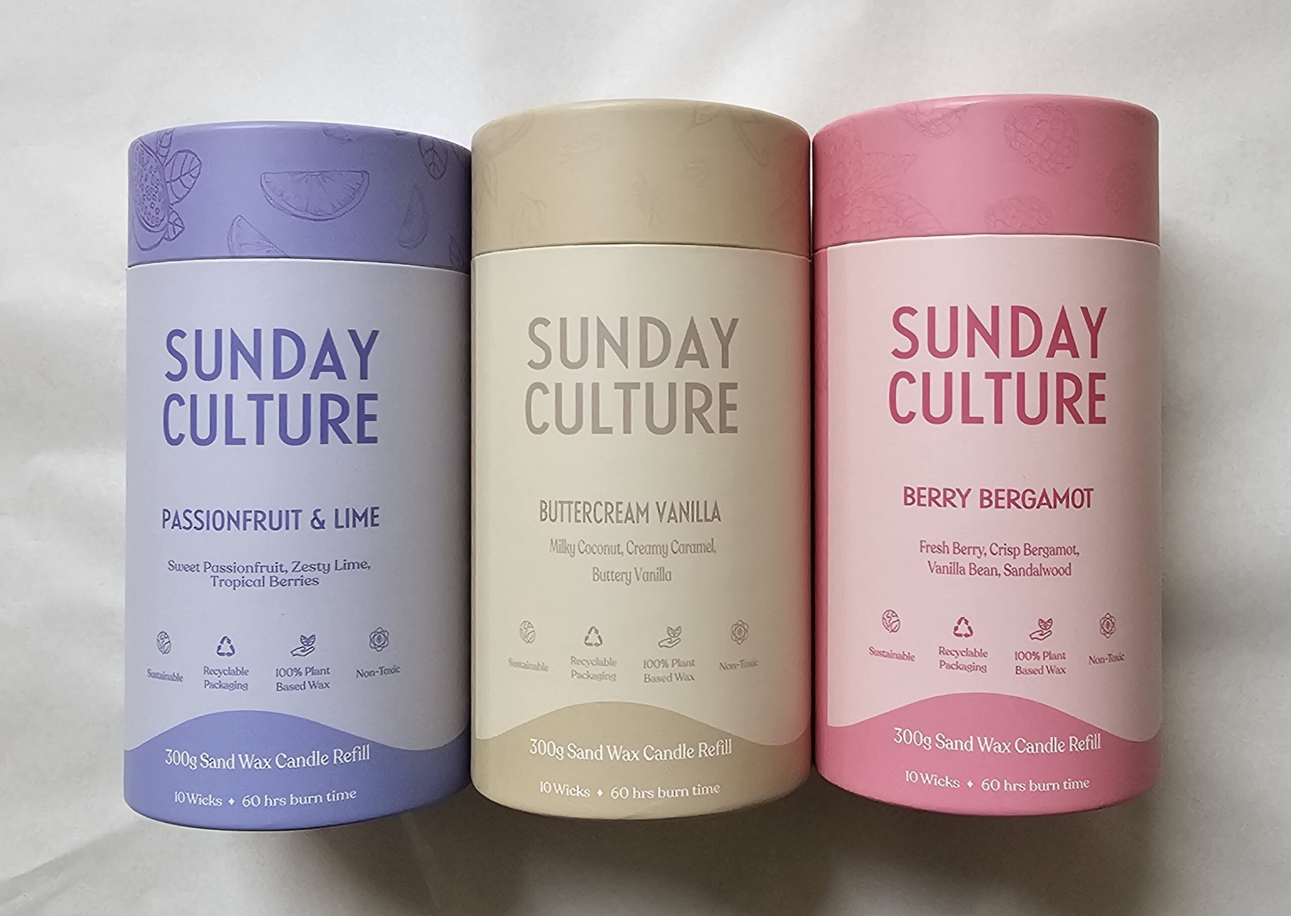 | Fragrance / Type | Passionfruit & Lime Candle, Berry Bergamot Candle, Buttercream Vanilla Candle, P&L Sand Wax Refill, BB Sand Wax Refill, BC Sand Wax Refill |